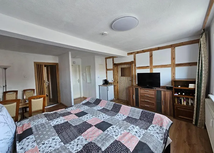 Das Apartment ist mit einer Küchenzeile für den Komfort der Gäste ausgestattet. Zu den Selbstversorgereinrichtungen gehören auch eine Minibar. Die nächstgelegene Bushaltestelle Temporare Haltestelle Rathaus befindet sich in 350 Meter Entfernung zur Ferienwohnung In Stadtroda.